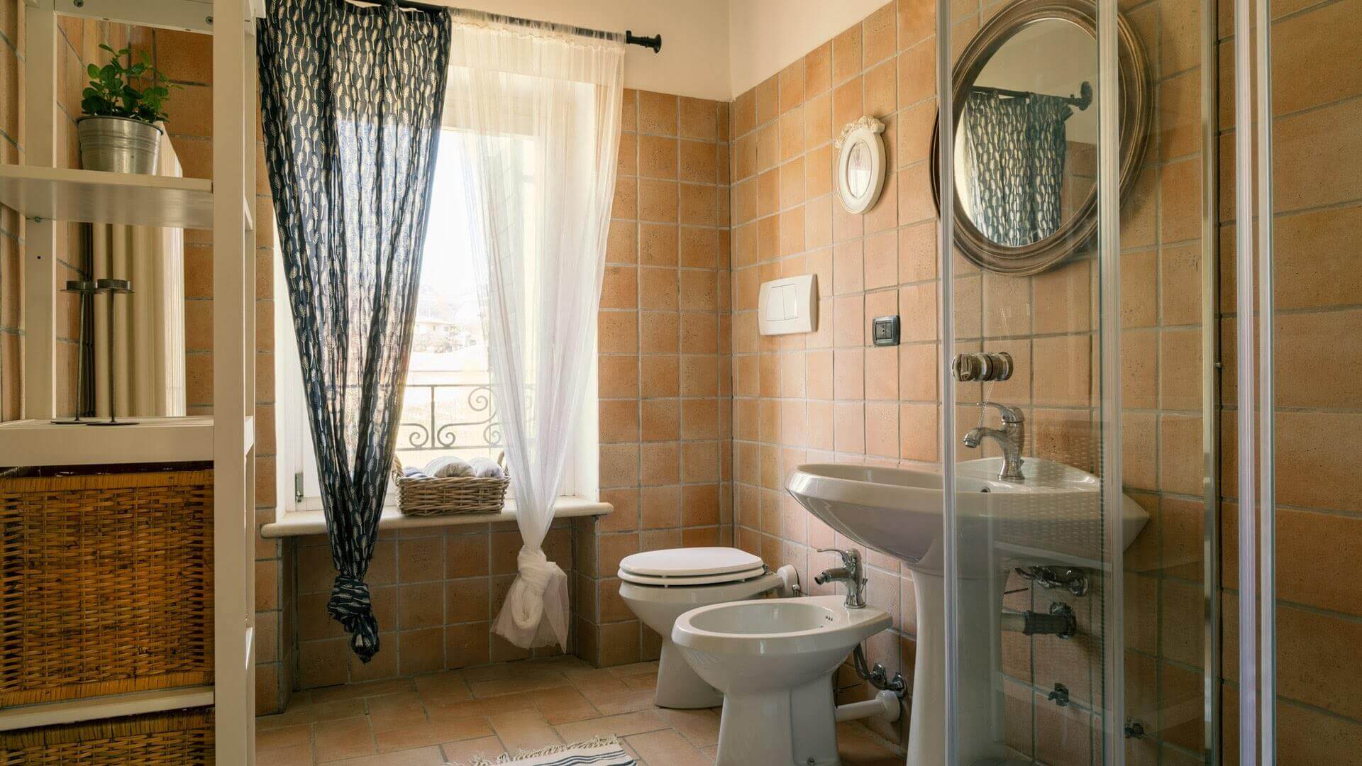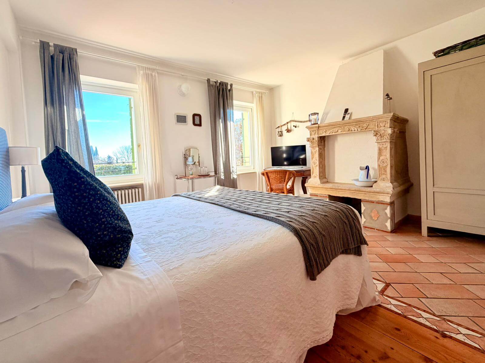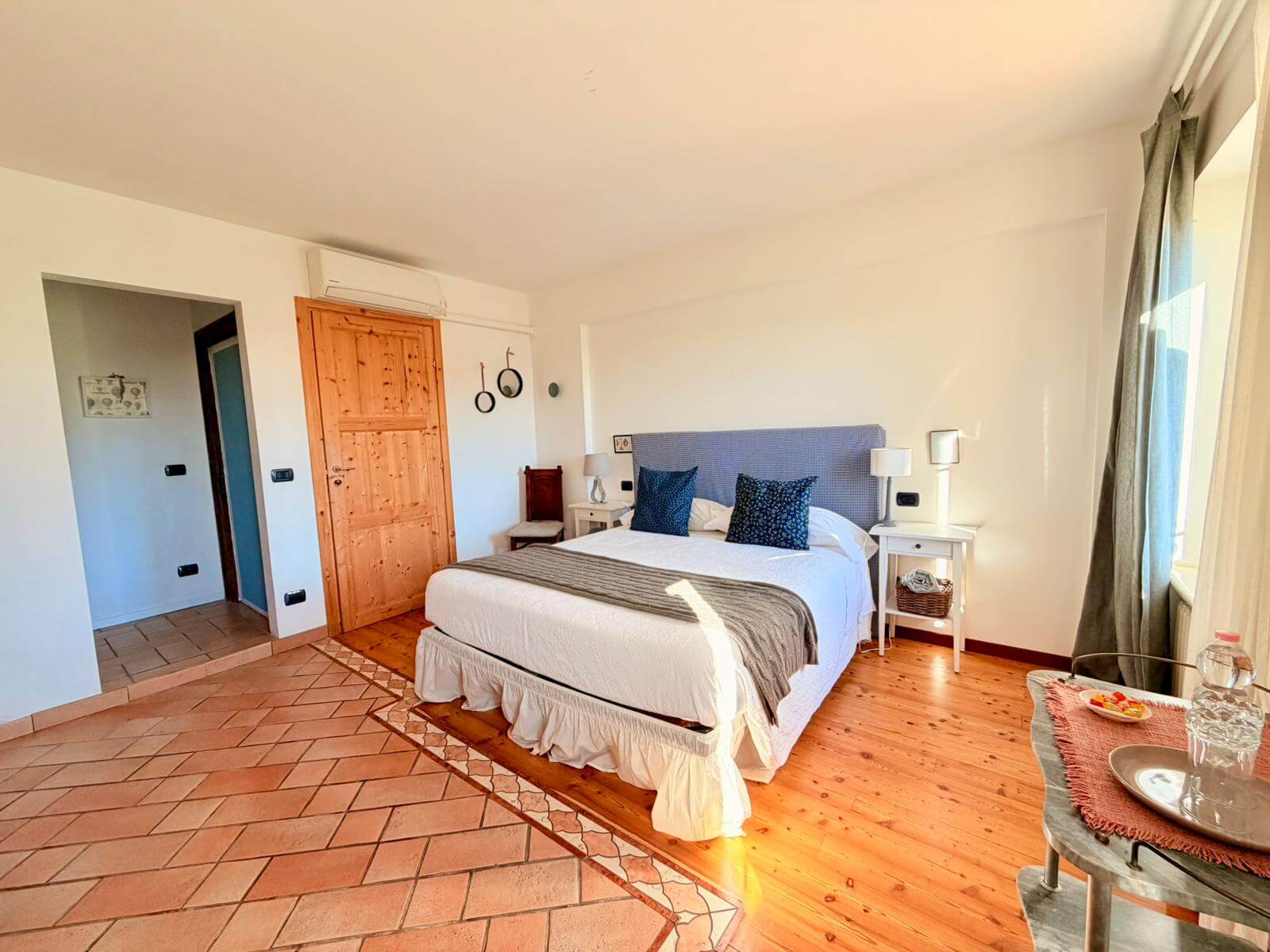 La camera Camino è al primo piano della casa ed è molto luminosa, con vista sulla terrazza della casa e sul giardino. Fornita di un letto matrimoniale, pavimento a parquet e cotto, televisione, aria condizionata con inverter, armadio, bagno ampio con doccia.